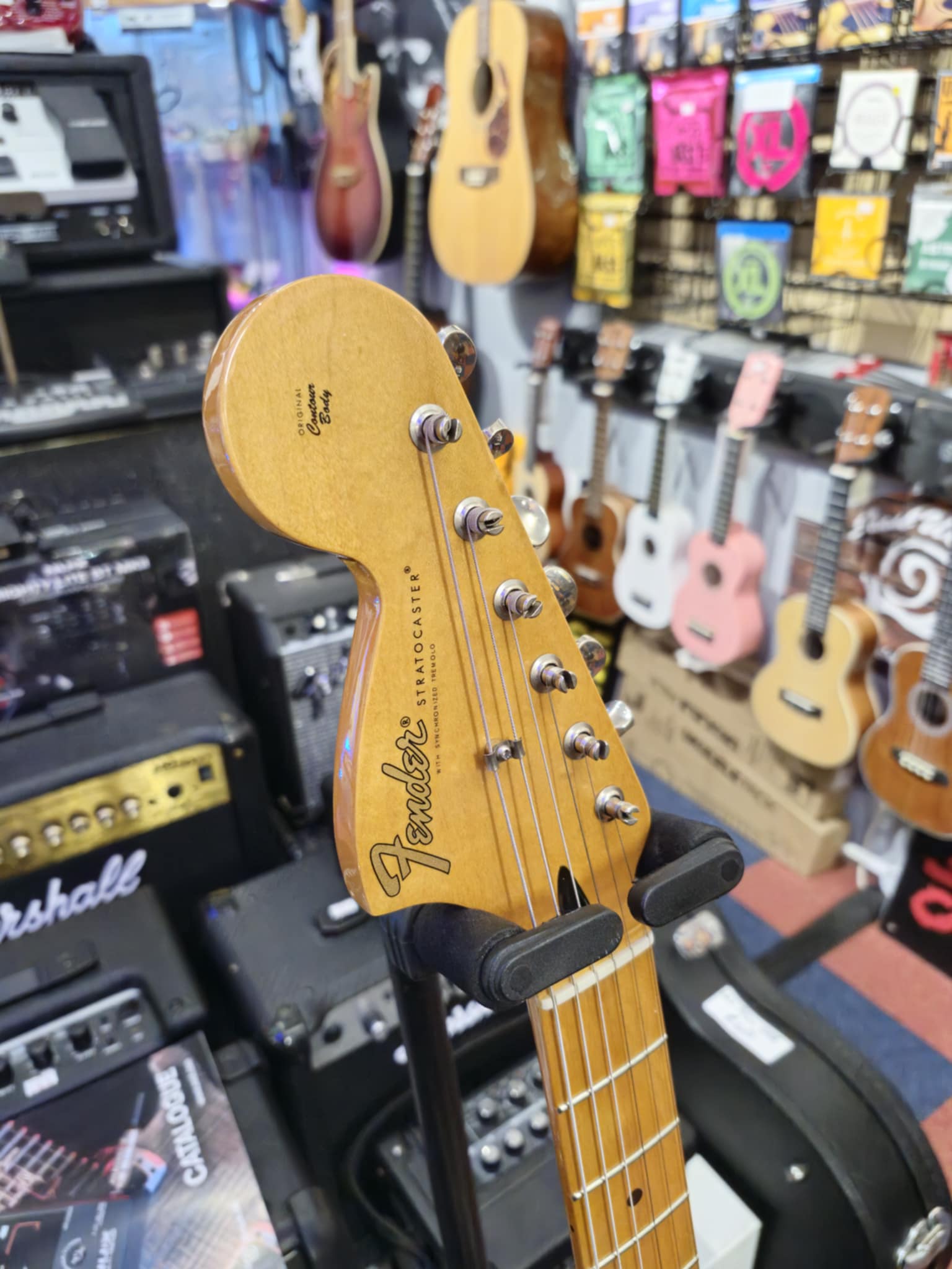 Mirroring Hendrix’s penchant for playing right-handed guitars flipped over, the reverse ’70s-style headstock on this guitar alters the relative length of the strings—creating a unique playing feel while adding more snap to the treble strings.