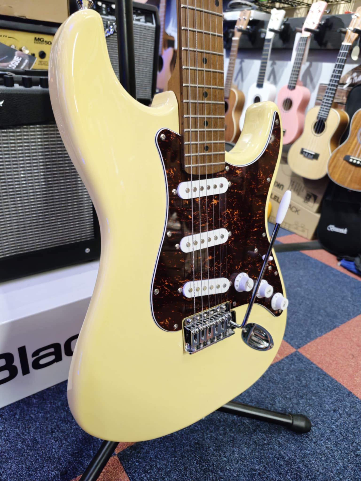 This guitar is a S-type guitar, featuring the typical appointments that you would expect, in including 3 ceramic magnet singlecoil pickups, wired up to a 5 way selector switch with a single volume and 2 tone controls. The 6 point tremolo is responsive and is set as floating, allowing for Hank Marvin style flutters and warbles!