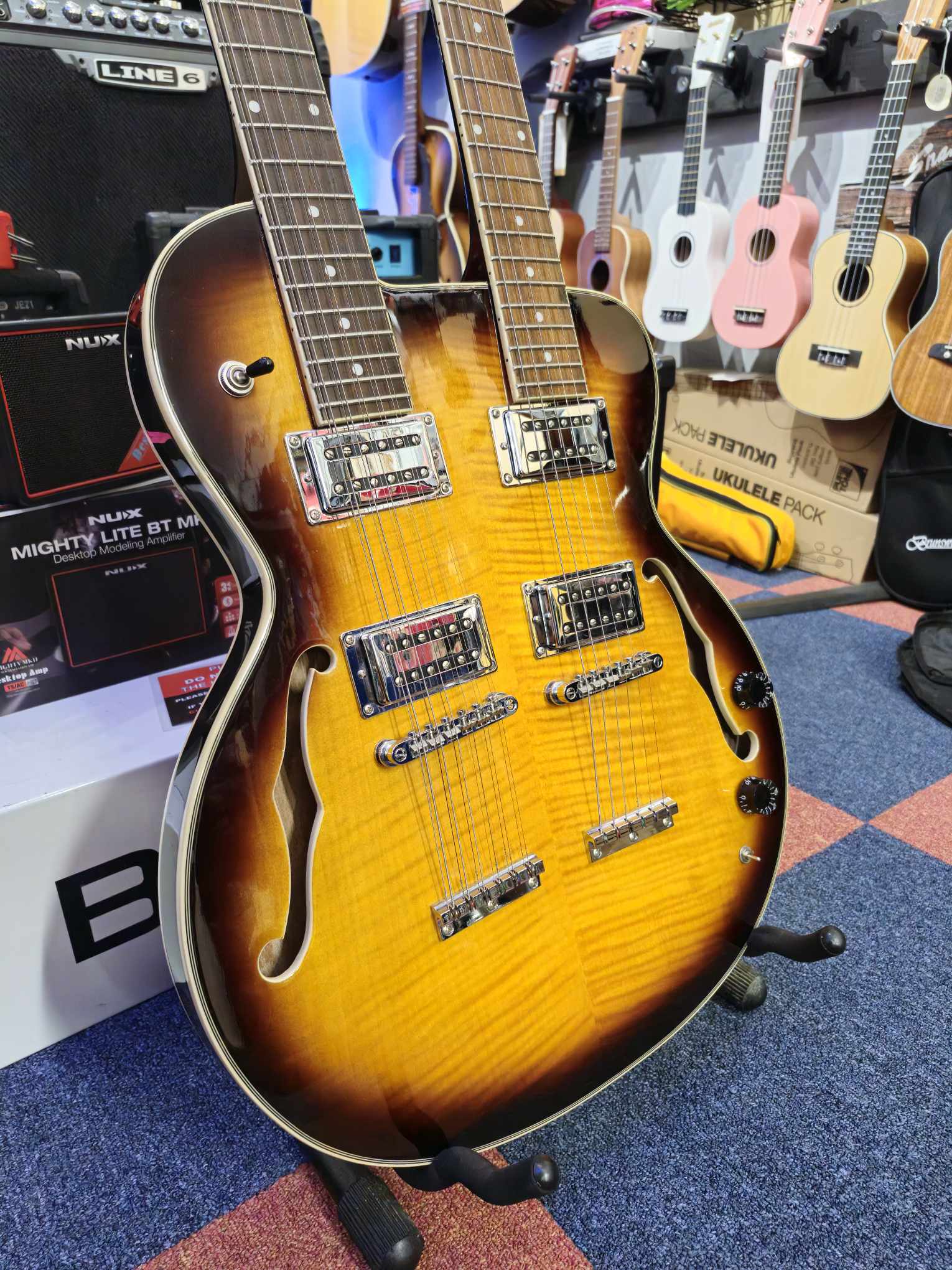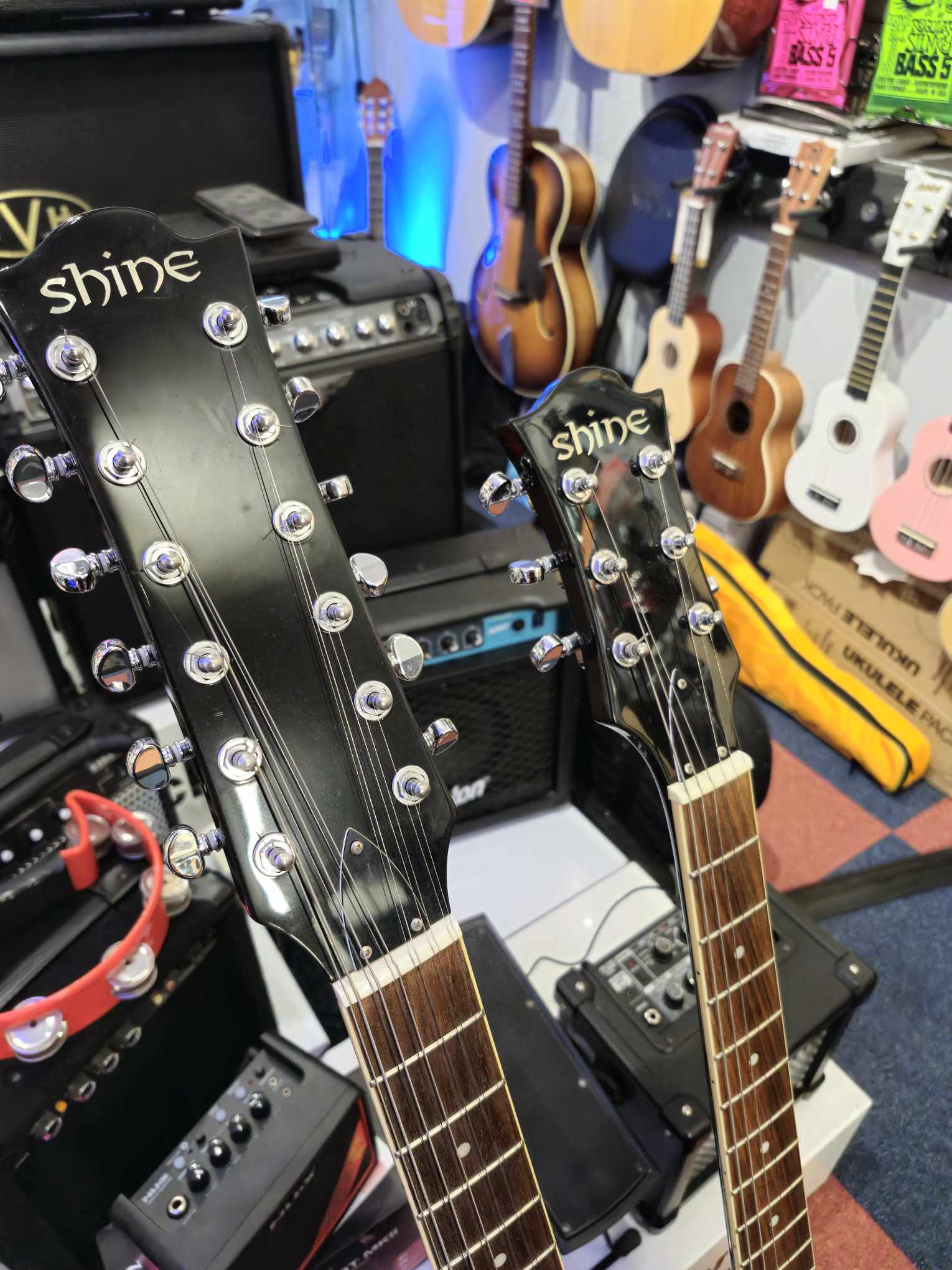 The Shine SNOD1000 is a double neck guitar that covers a lot of ground. With 2 necks featuring 6 and 12 strings respectively, this guitar allows for a plethora of different tones just from swapping between the 2 necks.